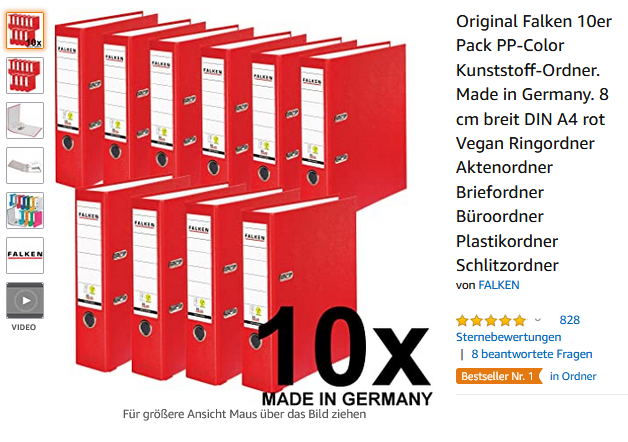 Die Kunststoff-Ordner von Falken gibt es in vielen attraktiven Farben. Neben dem Rot des Screenshots gibt es auch Ordner in Farben wie Grün, Blau und Rosa. Glücklicherweise sind viele Varianten schön billig erhältlich.