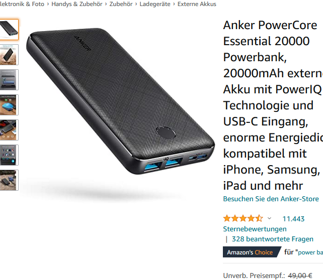 amazon.de-Screenshot Anker PowerCore Essential 20000 Powerbank